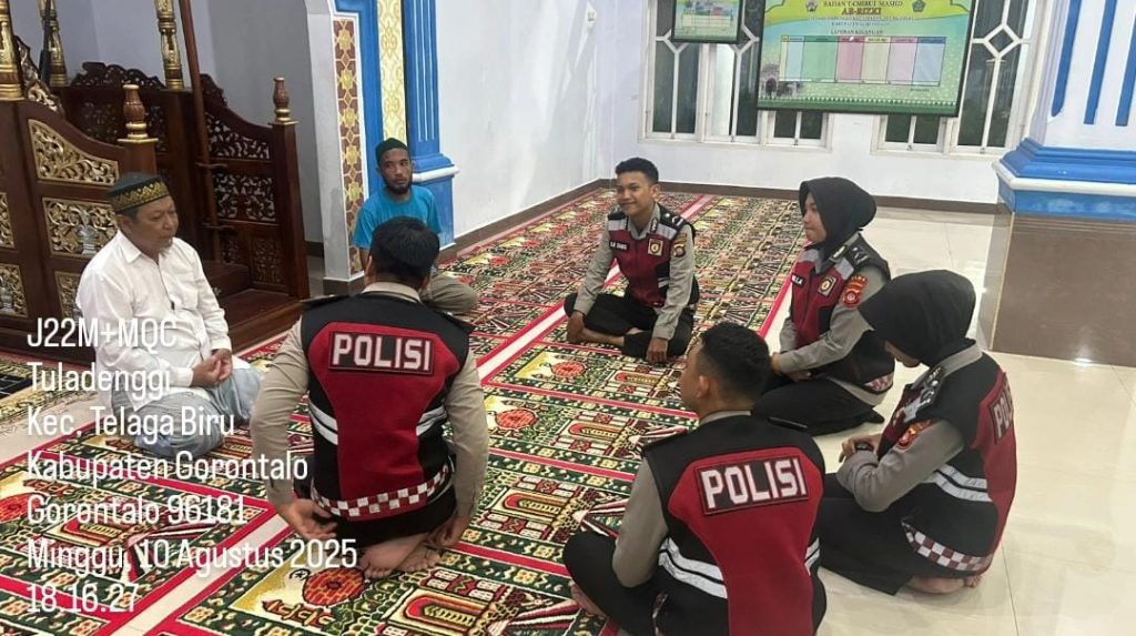 Gorontalo – Personel Patroli Kota Presisi Direktorat Samapta Polda Gorontalo melaksanakan kegiatan sholat Magrib berjamaah bersama masyarakat di Masjid Ar-Rizki, Desa Tuldenggi, Kecamatan Telaga Biru, Kabupaten Gorontalo, Minggu (10/08/2025) pukul 18.08 WITA.