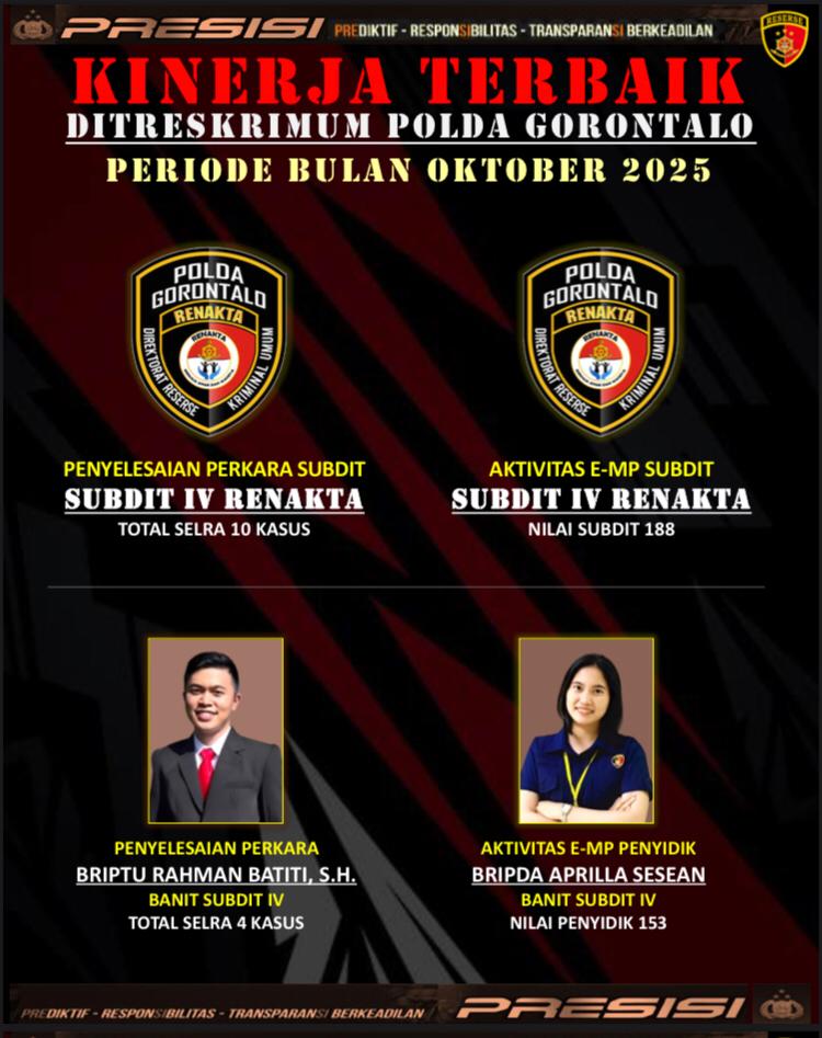 Tribratanews.gorontalo.polri.go.id - Direktorat Reserse Kriminal Umum (Ditreskrimum) Polda Gorontalo kembali memberikan apresiasi terhadap kinerja terbaik jajarannya melalui penilaian rutin bulanan....
