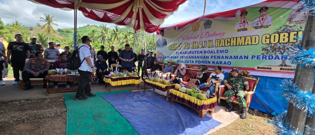 tribratanews.gorontalo.polri.go.id – Polres Boalemo menunjukkan sinergi kuat dengan Forkopimda dalam mendukung kemajuan ekonomi masyarakat melalui kegiatan kunjungan kerja Wakil Ketua DPR RI Dr. (H.C.) Rachmad Gobel. Pada Jumat (19/12) pukul 10.14 WITA di Dusun III Desa Lahumbo, Kecamatan Tilamuta, dilakukan pencanangan penanaman perdana 2 juta pohon kakao yang diharapkan jadi game changer bagi petani lokal.