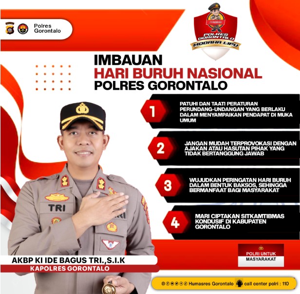 Polres Gorontalo – Kepala Kepolisian Resor Gorontalo AKBP Ki Ide Bagus Tri, SIK, menyampaikan beberapa himbauan Kamtibmas terkait peringatan Hari...